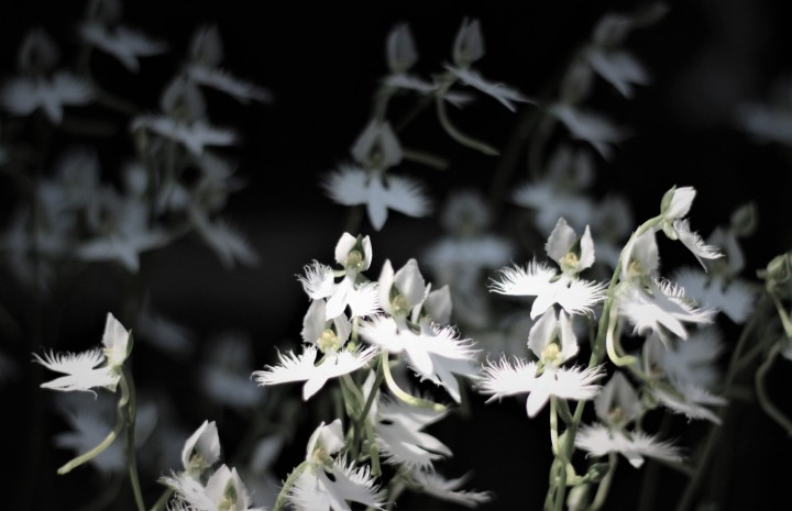 陽はまだ十分の明るさと暑さを残しているが、それでも薄墨を塗り重ねるように鷺草の周囲を暗くし始める。その分鷺草の白さが際立ち始めた。