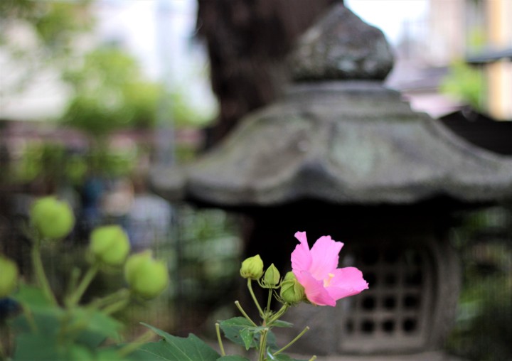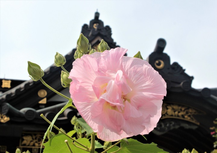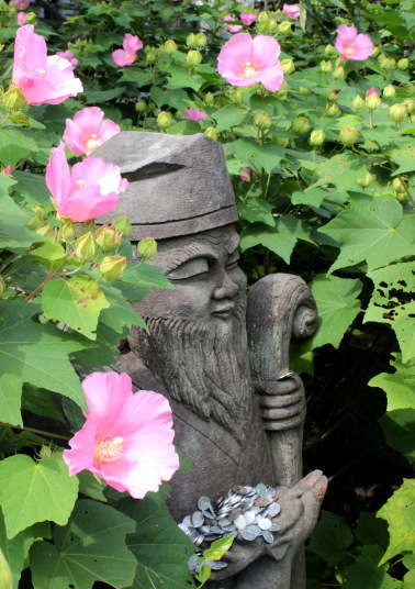 決して大きな寺ではない妙隆寺は観光客が足を運んでは来ない様だ。七福神の寿老人を祀り、境内に寿老人の石像も置かれ、芙蓉の花が老人を守るように咲いている。その芙蓉の中に酔芙蓉もまた紛れ込むように咲いている。陽は中天にあり、射す陽は強い。それでも花はけなげにしゃんとしている。一日の命である。この程度の暑さに参るものかと粋がっているようだ。酔芙蓉も熱い風に揺れながらこれから一層色を濃くしようとしている。