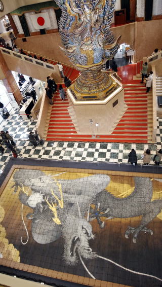 今年(2024年)2月に日本橋三越で寛永寺の根本中堂(本堂)に張る天井画が公開された。来年、創建400年を迎えるのを記念して、画家であり東京芸大名誉教授の手塚雄二さんの作品、阿形・吽形の双竜が描かれた「叡嶽双龍」。6m×12mの日本最大級の大きさの天井画は三越のシンボルである5階までの吹き抜けに立つ巨大な天女像に勝るとも劣らぬ迫力で見る者を圧倒した。