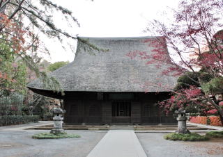 仏殿(萱葺入母屋造 山門と同様岩槻より移築 本尊安置 阿難尊者と迦葉尊者が脇侍 外から拝顔できる)