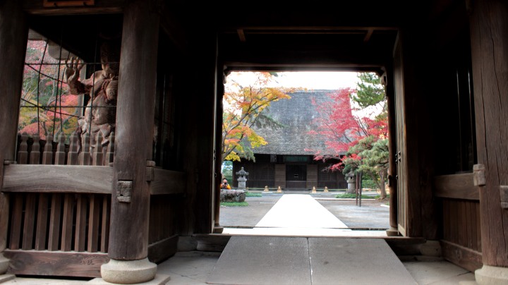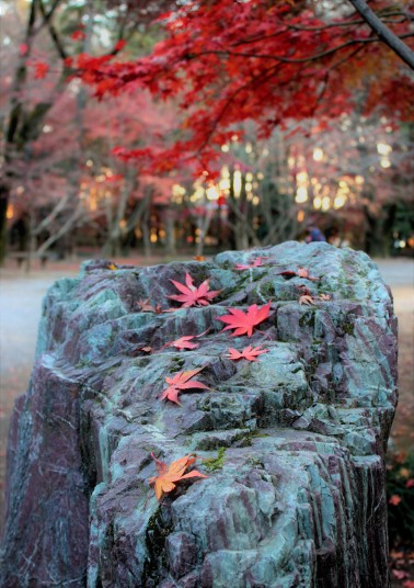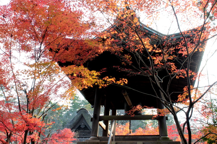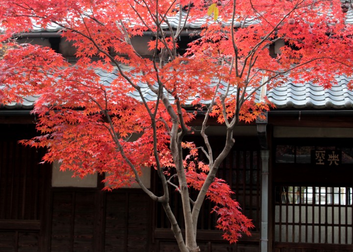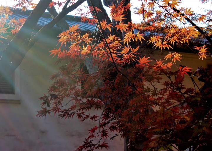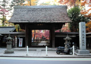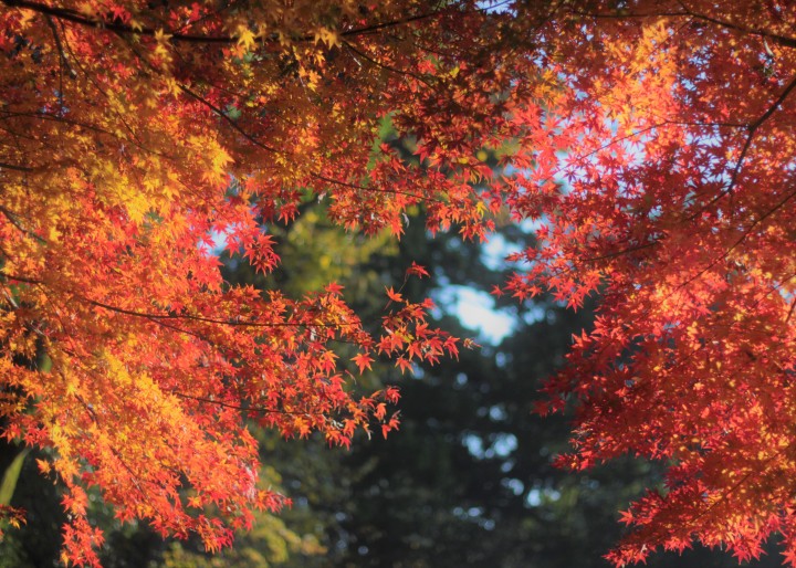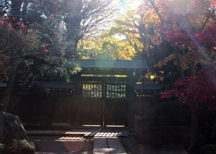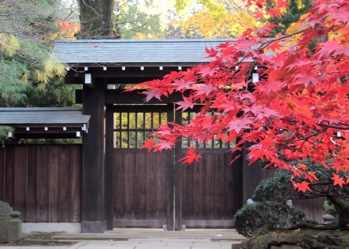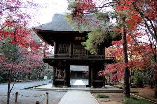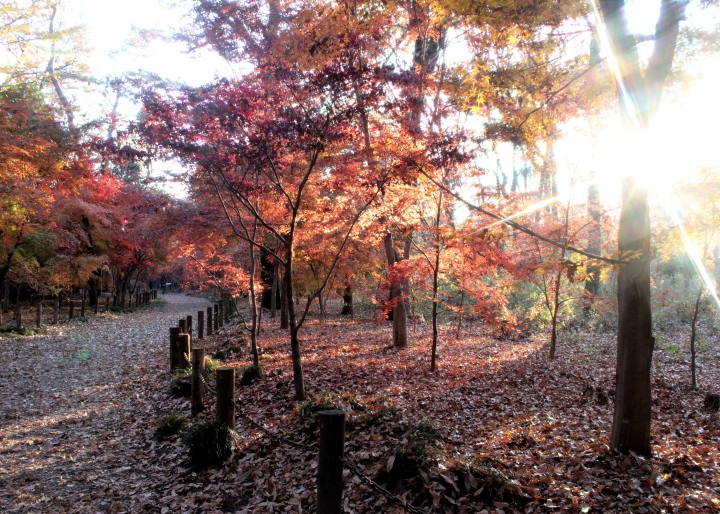 国木田独歩の作品「武蔵野」が発表されて以来「雑木林の武蔵野」は人口に膾炙する。北は川越、西は府中の広大な落葉樹の野は「武蔵野を散歩する人は、道を迷うことを気にしてはならない。どの道でも足の向く方へゆけば必ず其処に見るべく、聞くべく、感ずべき獲物がある」と独歩が言う広大さは望むべきもないが、ここ平林寺の雑木林は遊歩道のお陰で道を迷うようなことはあり得ない。それでもその面影は十分に味わえる。独歩が触れることはほとんどないモミジが遊歩道に沿って或いは伽藍の周囲に植えられている。茅葺屋根の総門を潜るとまっすぐに伸びる敷石から正面に山門である楼門形式の茅葺の仁王門が聳立しその奥に同じように茅葺の仏殿がそれぞれ木肌になった伽藍を形作っている。道場が、鐘楼がそして本堂、本坊が置かれそれぞれの建物の近くにモミジの木が配されている。晩秋から初冬にかけて一斉に紅葉する。栗、コナラ、橡などの高木はそれぞれに葉を落とし始め、高木にそれまで陽の多くを遮られていたモミジ葉の紅葉は輝きを増す。殊に閉門間近い夕方、陽が傾き、最後の輝きは遊歩道を覆うように紅葉のトンネルを錦秋という表現に妖しさを漂わせ「この樹登らば鬼女となるべし夕紅葉」という三橋鷹女の句を彷彿させる。蕎麦屋のご婦人の言葉に嘘はない。
